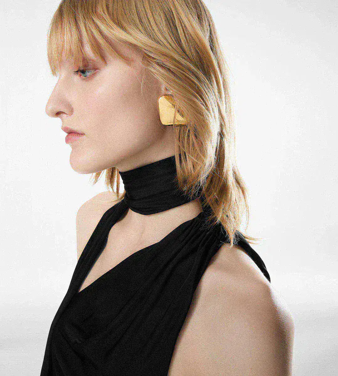 VESTIDO DE NOCHE CON CUELLO HALTER Y DETALLE DE HERRAJES METÁLICOS