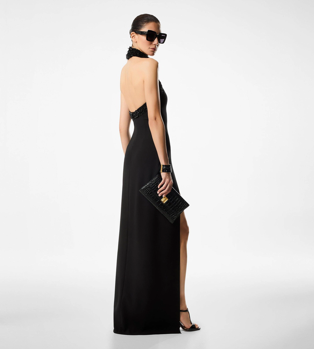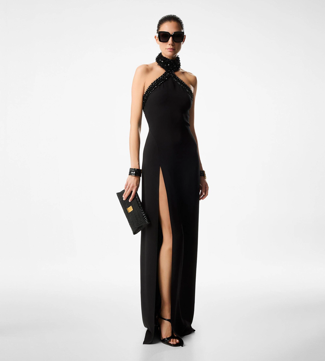 VESTIDO DE NOCHE CON CUELLO HALTER BORDADO