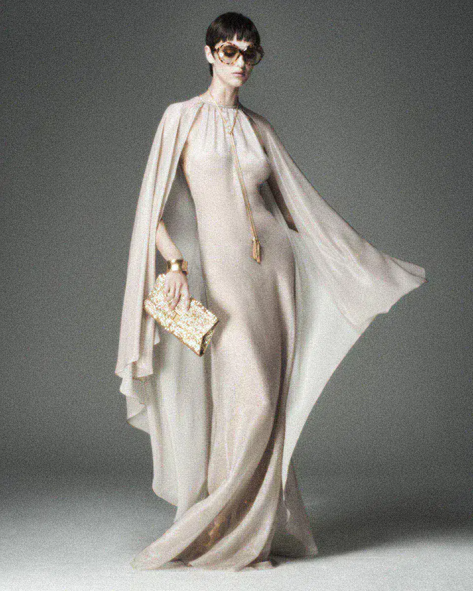 - VESTIDO DE NOCHE CON MANGAS DE CAPA ASIMÉTRICAS